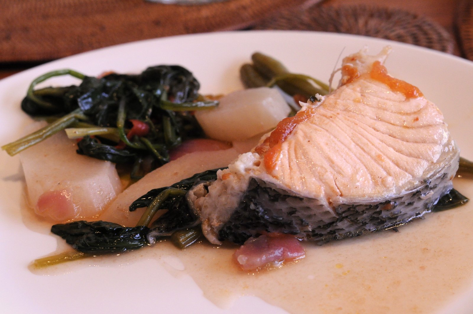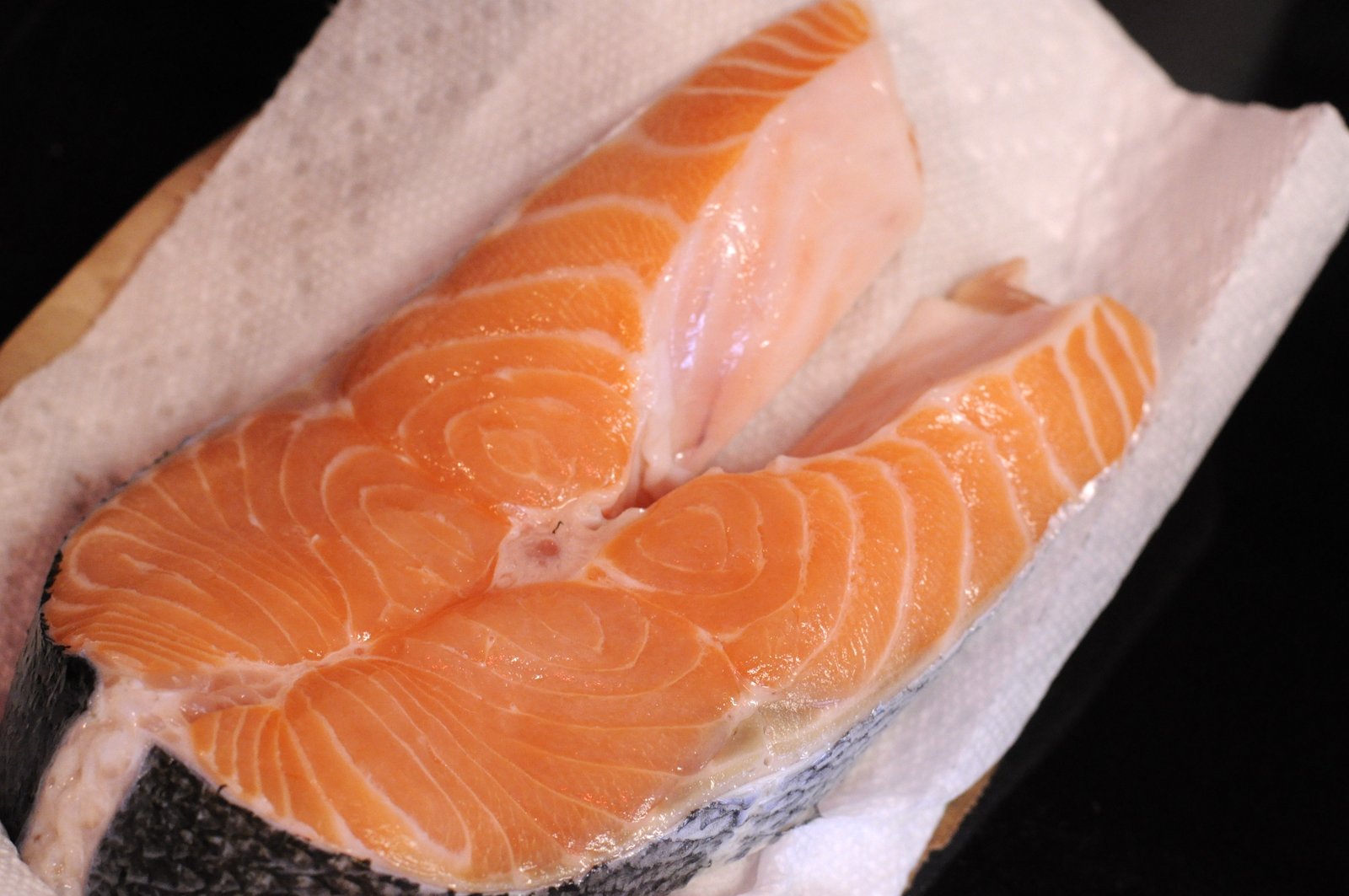 We chose a nice chunk of salmon steak because it cooks quickly and has a great flavor for the soup.