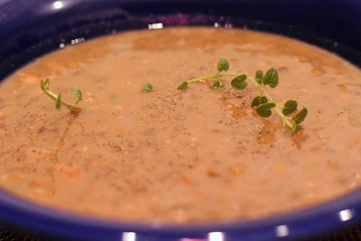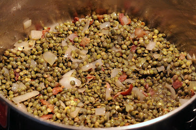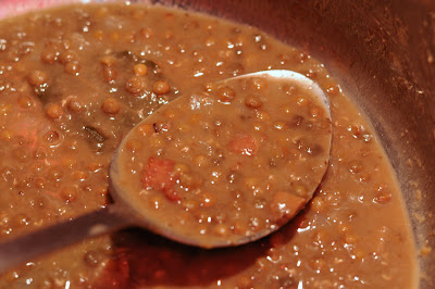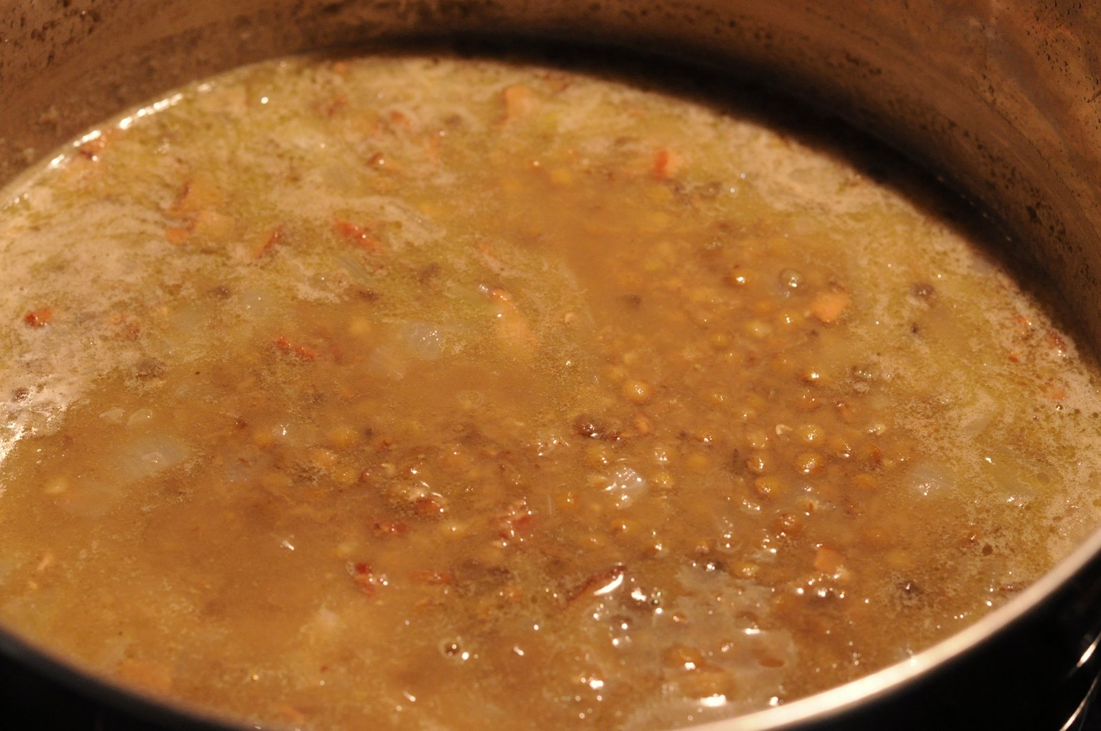 In a large pot, brown the meat until crispy then add the onion. Add the pre-soaked lentils and stir for a few minutes. This allows the flavors to seep into the beans. Add the stock and simmer covered on low heat for about an hour and a half, stirring every thirty minutes. Soup is done when beans are soft and the broth is brown and beginning to get thick. Mix well. Serves four.