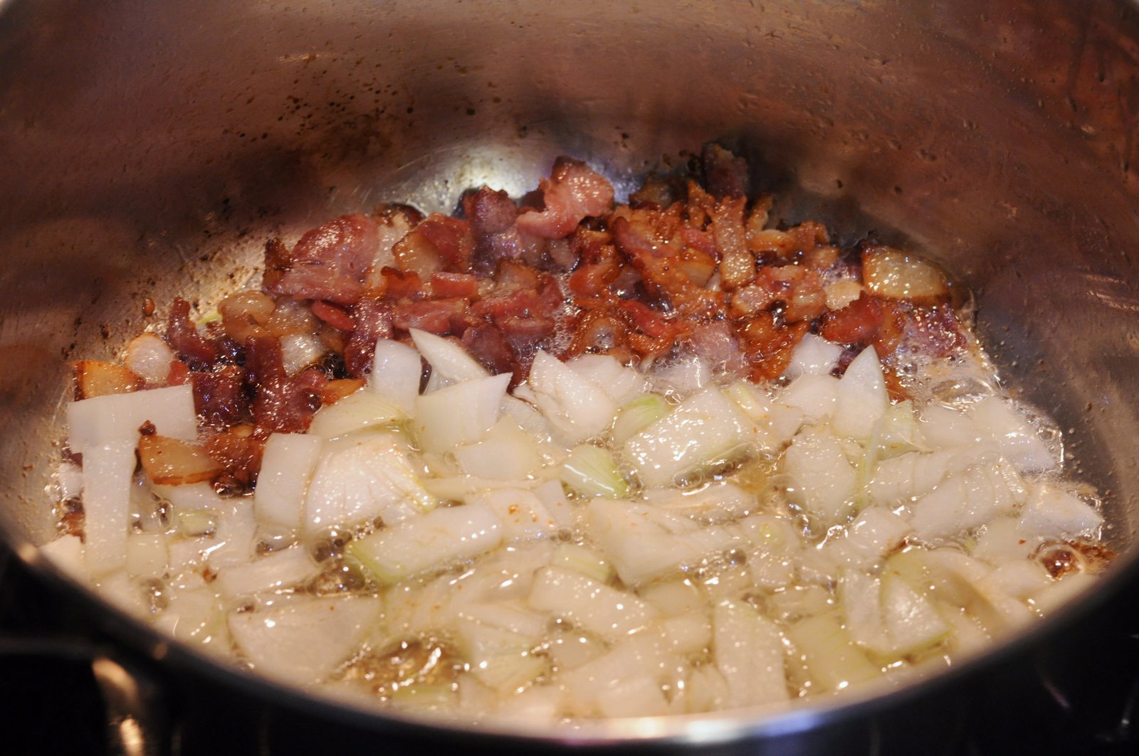 We begin by browning some bits of bacon or any other smoked meat (ham, hock, duck, etc). When the meat is brown and crispy, add a whole head of onion, chopped.