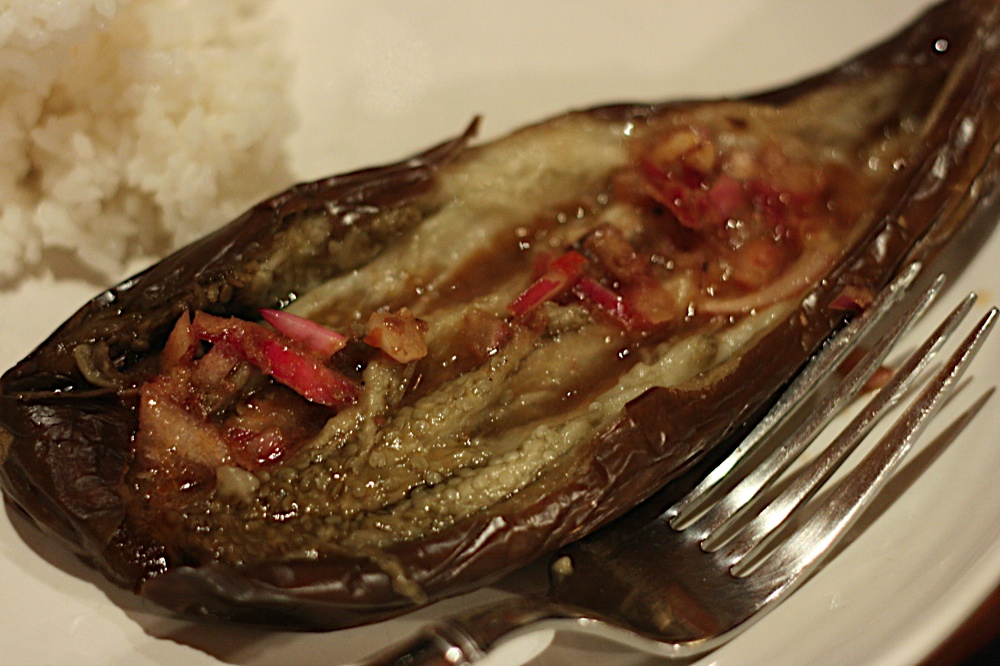 Grill eggplants or wrap in foil and bake at 350 C for 40 minutes. Unwrap and open up eggplants and spoon sauce over eggplant meat before serving.