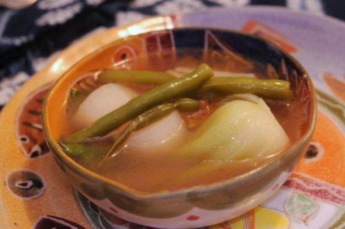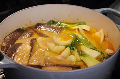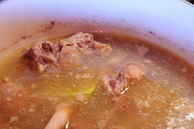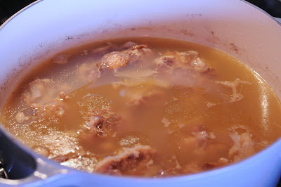 Peanut butter and annatto are mixed into the broth, resulting in an orange color.