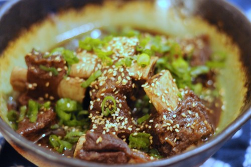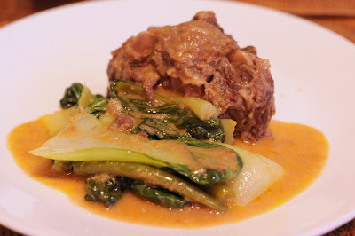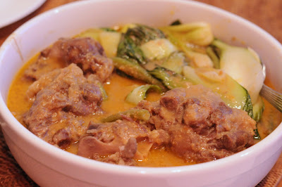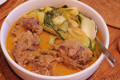 Kare-kare is a peanut-based stew made with peanut butter and rice. The secret ingredient of this dish is the rice that is roasted in a pan until brown and then ground until fine using a mortar (as in my youth), or a coffee grinder (something I discovered when I started making this myself). Kare-kare may be made with beef or pork, oxtail or pork tails, hocks or knuckles, beef tripe, vegetables, or seafood. It is a rich dish that is a regular in gatherings and fiestas, and is always memorable and in short supply. (Recipe below)