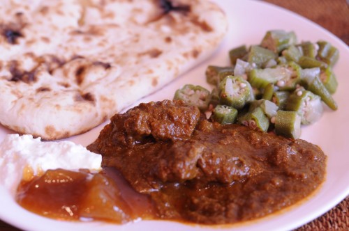 - Vindaloo, sauteed okra, mango chutney and greek yogurt.