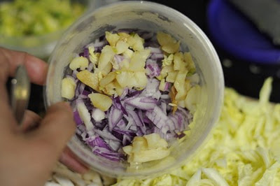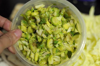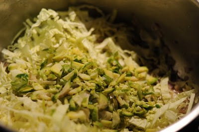 Add the cabbage and brussels sprouts (ideally carrots too, if available)