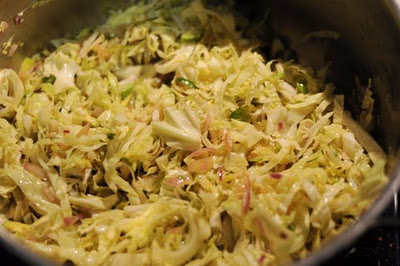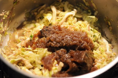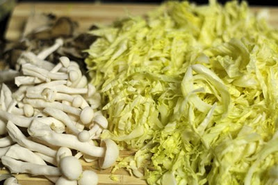 1/2 head small cabbage, cut into strips. Bunapi and maitaki mushrooms (in place of meat).
