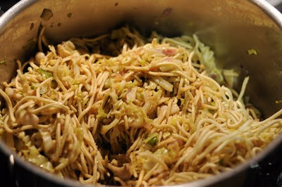 Coat the noodles with sauce by mixing the vegetables with the noodles.