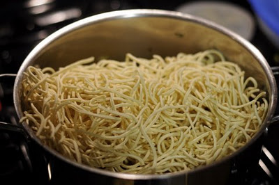Noodles are cooked when soft and moist. Add sauce or water if needed, depending on taste.