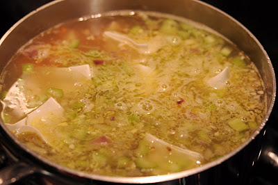 Saute celery and then add chicken broth, stock or bouillon and water.