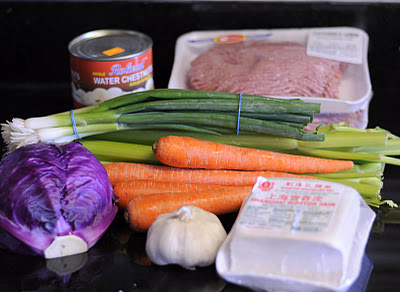 We begin with some key ingredients, namely ground pork, water chestnuts, scallions, celery, cabbage, garlic, and wonton wrapper. You may find water chestnuts and wonton wrappers in good grocery stores, if not Asian markets.
