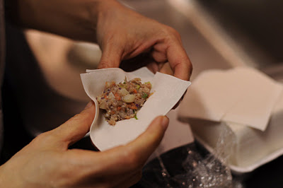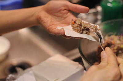 Season and mix very, very well. I like to test the mixture by microwaving a dollop of it in a small bowl for thirty seconds so I am assured of its flavor before making the wontons.