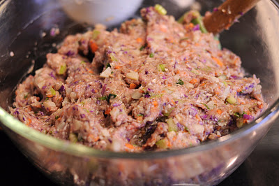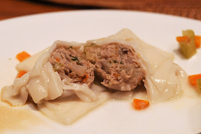 Filling: Mix together pork, onion (set aside 1 tablespoon for the broth), garlic (set aside 1 tablespoon for the broth), finely chopped carrots, 2/3 of the celery (set aside the rest for the broth), cabbage, scallions and egg. Mix well and season with salt and pepper. Test the mixture’s taste by microwaving a dollop of it for 30 seconds.