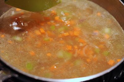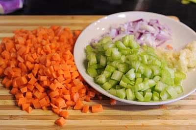 I cube two stalks of the carrots to include in the broth, but finely chop the rest to mix