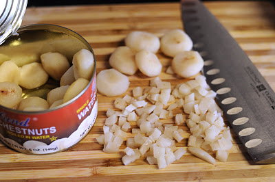 I chop all the other vegetables finely using a food processor, except for the water chestnuts, celery and half of the carrots. Here the water chestnuts are chopped in quarter inch cubes.