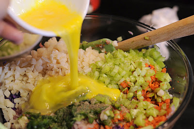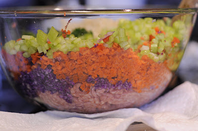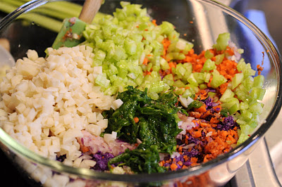 Here they all are in the bowl. Half of the scallions, half of the carrots, celery, water chestnuts,