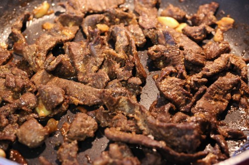 The beef is strained and fried. It creates its own liquid where it is allowed to simmer until cooked.