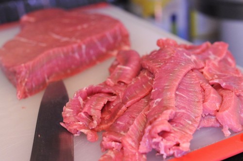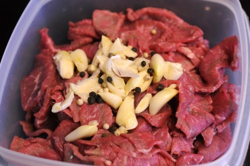 Mix the above ingredients together and marinate for at least 24 hours. Meat that won’t be cooked immediately may be stored bagged in the freezer. To cook, remove the meat from the marinade and fry in a hot non-stick pan, adding oil if necessary. The beef produces a lot of liquid which will help it cook while simmering. Cook until brown and serve with garlic fried rice and eggs.