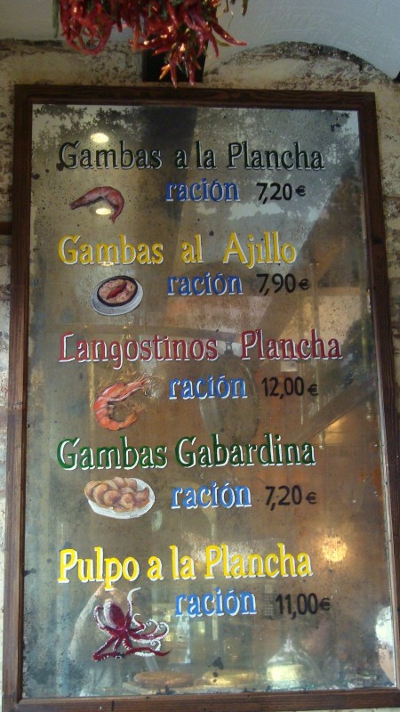 Ever since then I’ve longed to replicate that experience in New York, coming close food-wise at Boqueria, but not quite with the crowded and fancified seating. Upon entering Tertulia we were met with walls of weathered mirrors, just like in Bar Rodrigo, and painted signs on glass above a ham and cheese bar.