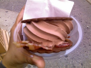 The popular treat craved by bacon-chocolate junkies is such a mysterious presence that it is a secret. It does not appear on any menus or specials posted each day. One searching for the mix of salt, smoke, meat, frozen milk and cocoa must learn to ask for it on the sly. And if one is so unfortunate as reach the front of the line after a thirty minute wait and end up with no Choinkwich, there is always the equally seductive mix of vanilla, dulce de leche, rock salt and chocolate dip, very aptly named for the images it conjures once it meets thy puckering gay lips: The Salty Pimp.