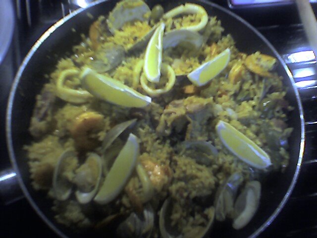 Mixsaffron into the broth and keep warm in a pot. In an 18-inch paelleraor a wide deep pan/saucepan with lid, brown the chicken in the oliveoil and set aside. Brown the chorizo and set aside. Using the same oil,sautee onion until clear and garlic until brown, then add rice and mixuntil coated. Season with salt and pepper. Add stock, chicken andchorizo. Cover and cook for 15-20 minutes then add the shrimp, squid,and clams hinge-side up. Add peas, and olives.Cover and cook until allthe liquid has absorbed and seafood is cooked. If rice is underdone,add another cup of stock and return to the fire for 5 to 7 minutes.Season with salt and pepper to taste and, if you choose, top withparsley. Serve with lemon wedges. (Adapted from The New York TimesMagazine)