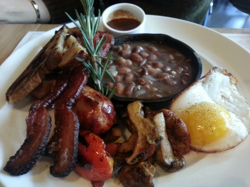 Full Brooklyn – duck egg, bangers, bacon, cranberry beans in a skillet, grilled tomato and mushroom.