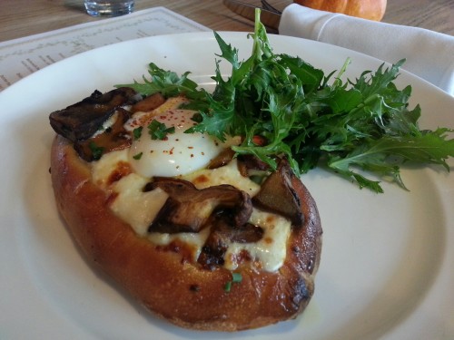 A toad in a hole is a traditional British breakfast of sausage and eggs in pudding batter, but Woodland’s is one with truffled mushrooms and farmers cheese.
