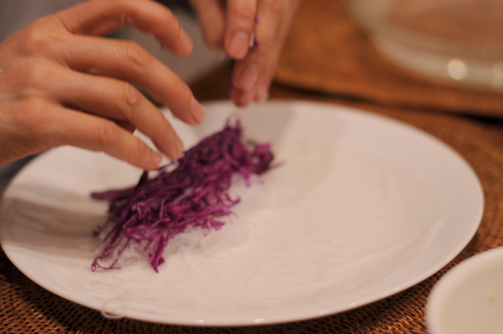 Red cabbage sliced thinly and cooked drained noodles.