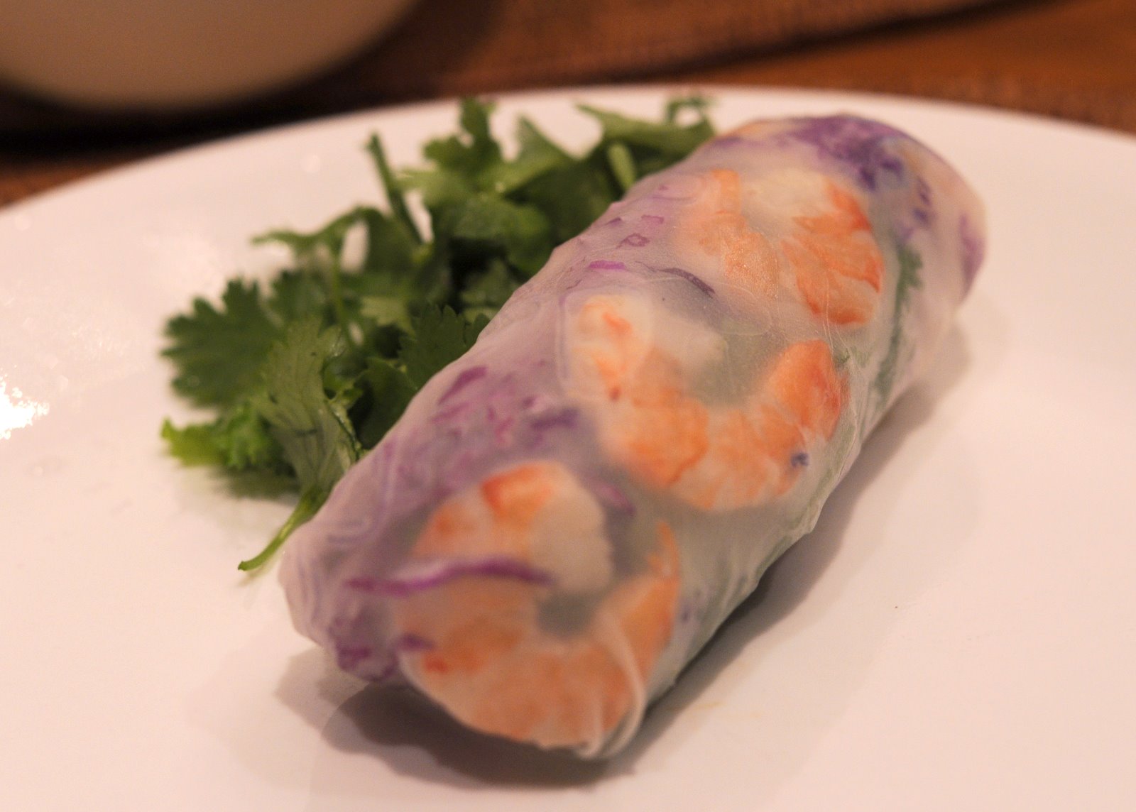 This summer roll contains vermicelli, red cabbage, cilantro and shrimp.