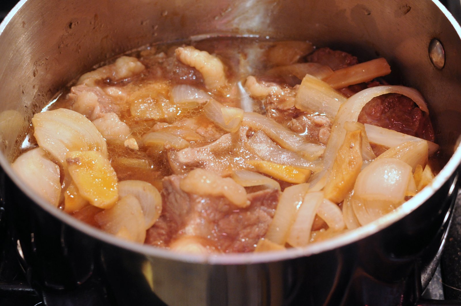 The rest of the ingredients are added: shoyu, vinegar, coconut oil, broth, bay leaf, garlic.